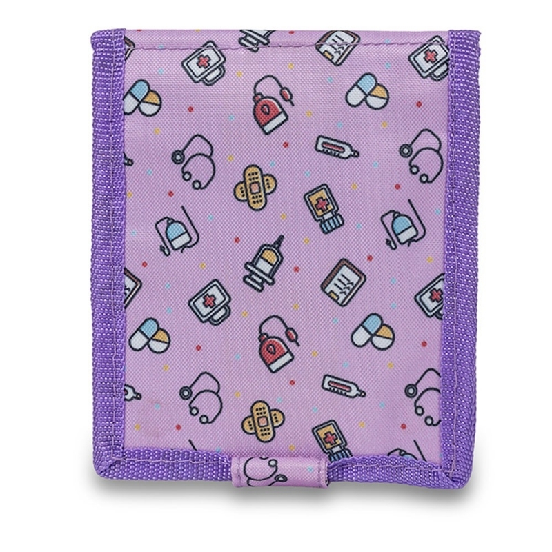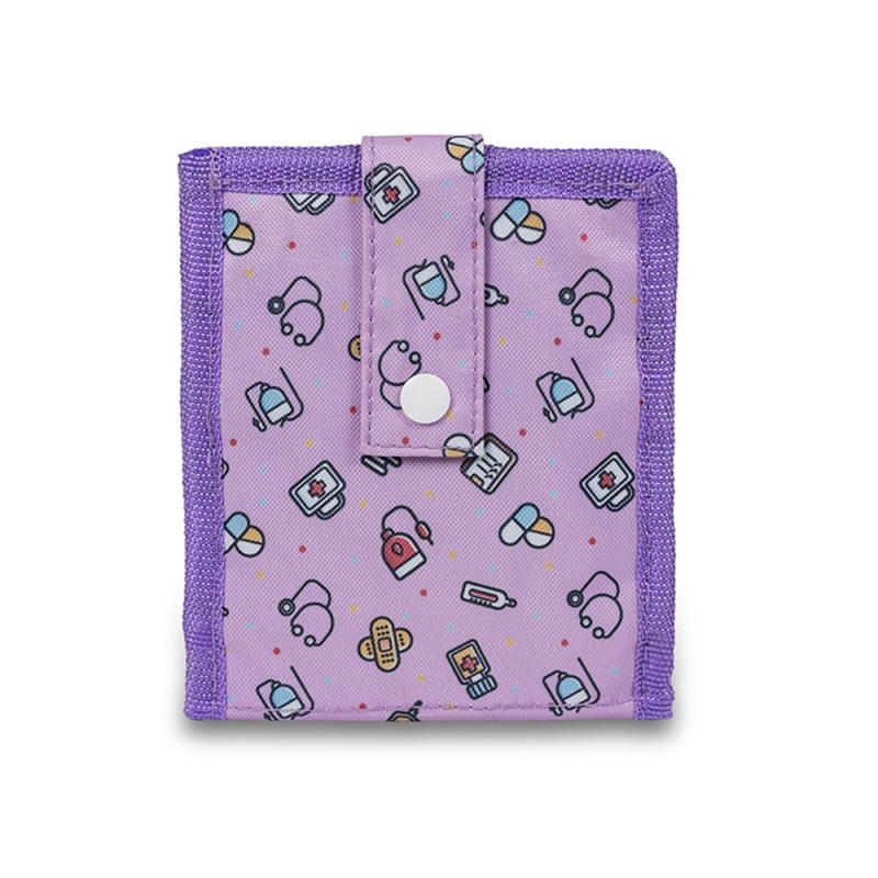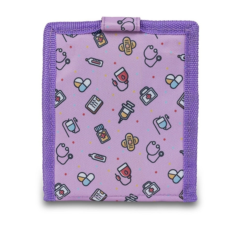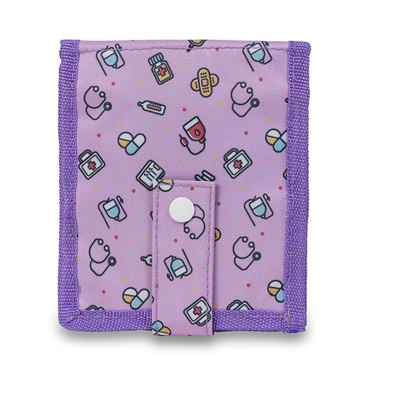 KEENS ESTAMPADO MORADO Organizador enfermería Pensado para ser transportado en el bolsillo de la bata y/o pijama para llevar los elementos necesarios en la enfermería intrahospitalaria, tales como: llaves de tres vías, tapones, linterna, pinzas, bolígrafo, esparadrapo, tijeras, etc. Sirve de forma independiente como organizador de mesa. Características Cierre con botón de presión metálico e imán 3 bolsillos planos interiores Bolsillo de rejilla Cinta para esparadrápo Sistema retractil de sujección de tijeras