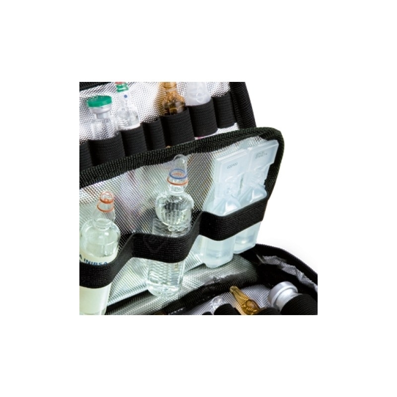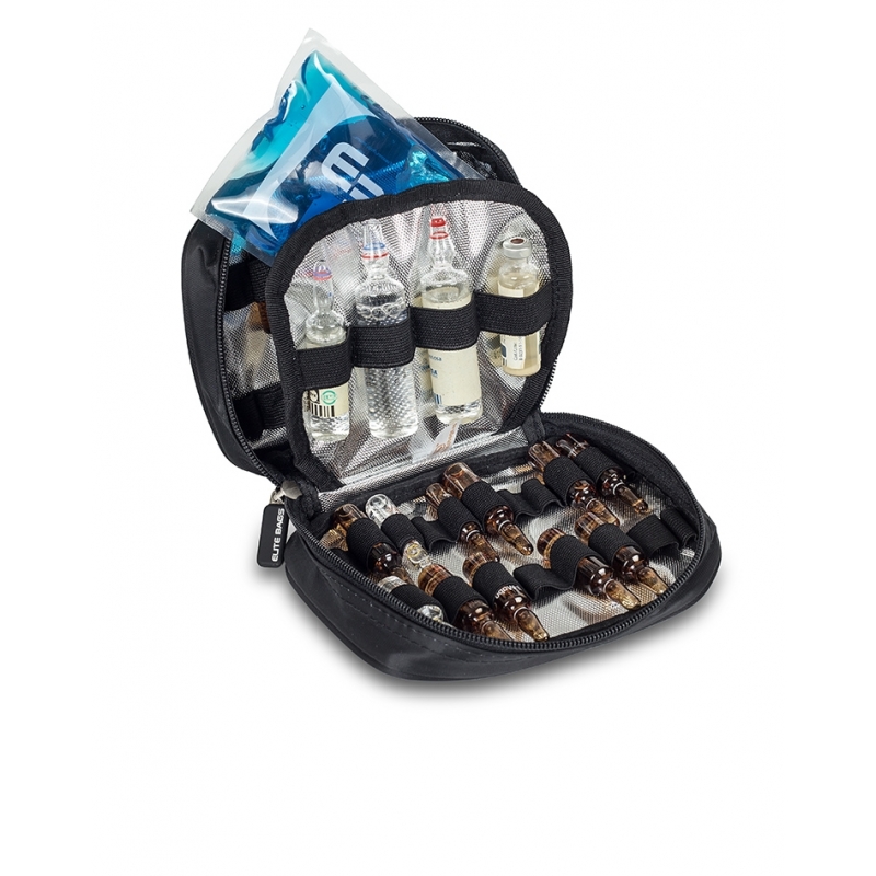 Ampulario médico isotérmico sarga negro PHIAL'S con capacidad para 50 ampollas, separador central acolchado con bandas elásticas y sujeción de velcro en la base.
