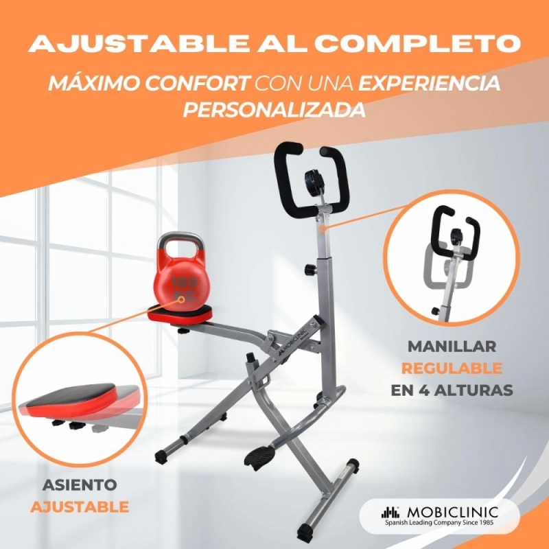 Su diseño ergonómico y moderno ofrece una doble funcionalidad, ya que se trata de un equipo cómodo con asiento acolchado y fácil de transportar y utilizar. Gracias a su opción de plegado podrás hacer uso de este horse rider directamente en casa o incluso en el jardín sin que ocupe demasiado espacio. Además, para favorecer la comodidad del usuario, su manillar puede ajustarse en 4 niveles distintos (desde los 28 a los 43 cm).