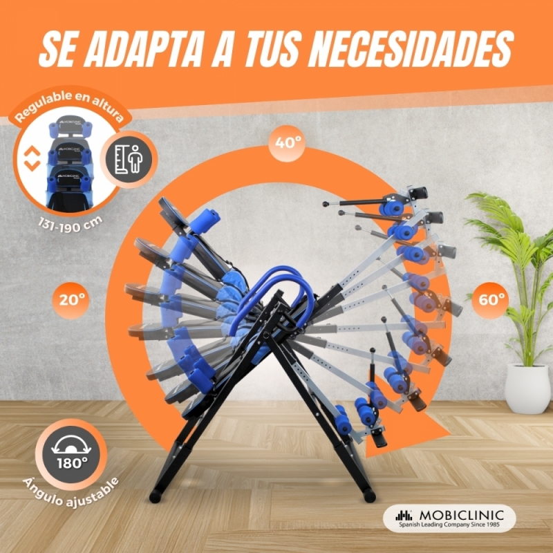 PASAMANOS AJUSTABLE: La tabla de inversión FlexiCare tiene un ángulo ajustable de forma manual para20º , 40º y 60º y se puede utilizar de forma libremente vertical con inclinaciones de 0 a 180 grados. Al llegar a los 180º la tabla no se puede mover más, imposibilitando que se haga un giro completo de 360º.