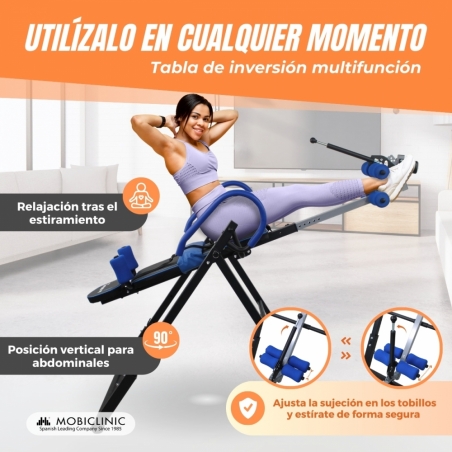 Su pasamanos ajustable te permite variar el ángulo de inclinación para 20º , 40º y 60º y se puede utilizar de forma libremente vertical con inclinaciones de 0 a 180 grados. Al llegar a los 180º la tabla no se puede mover más, imposibilitando que se haga un giro completo de 360º. Esta versatilidad te permite adaptar tu sesión de inversión según tus necesidades y preferencias individuales.