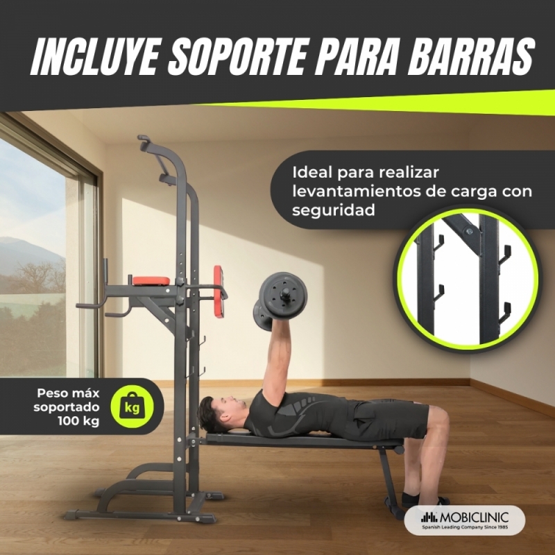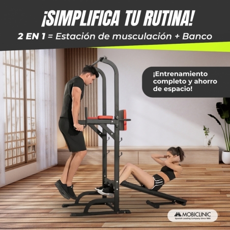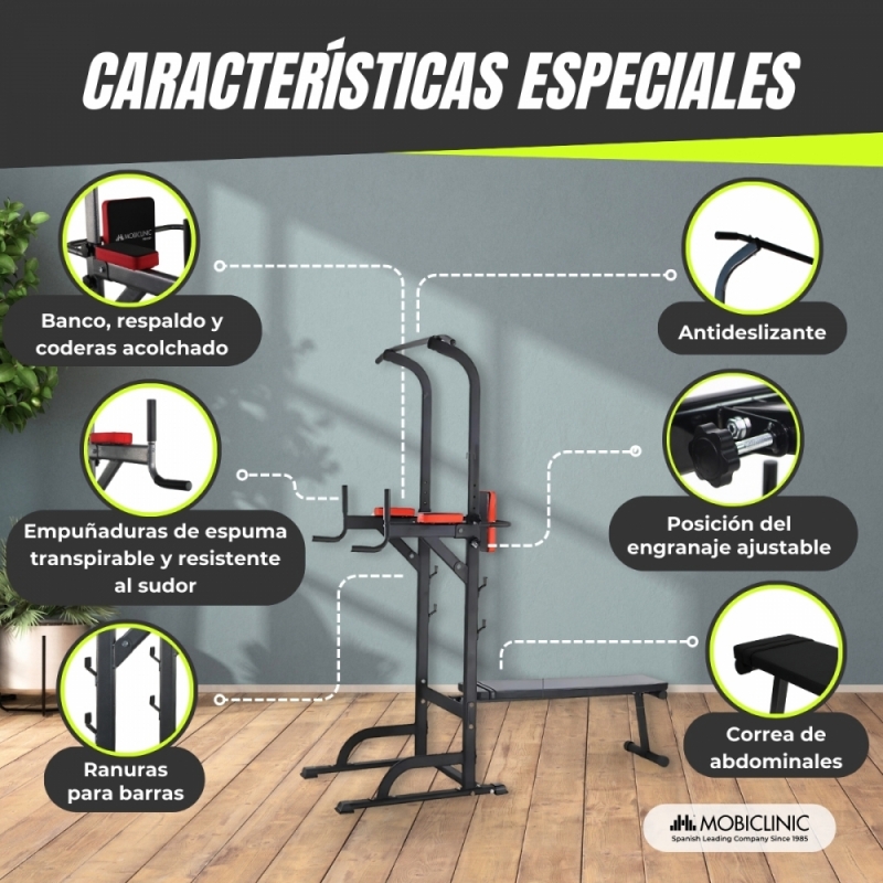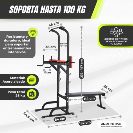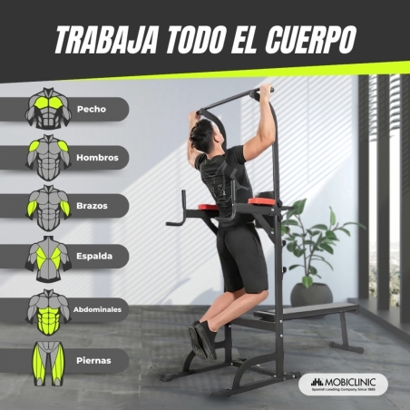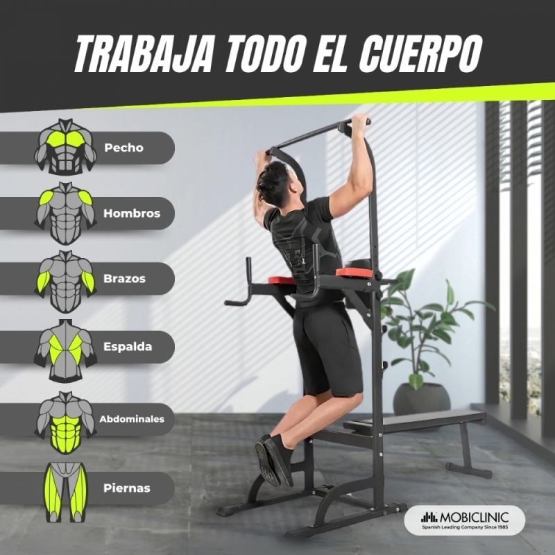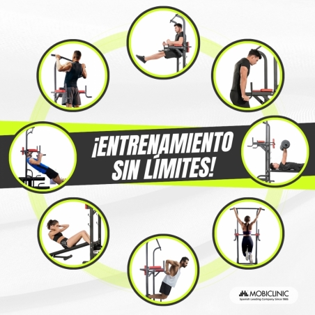 Multifuncionalidad en un solo equipo: Este equipo de fitness multifuncional permite realizar una amplia variedad de ejercicios: elevación de piernas, press de banca, dominadas, sentadillas, y más. Ideal para mejorar la fuerza de la parte superior del cuerpo y promover el desarrollo físico integral.