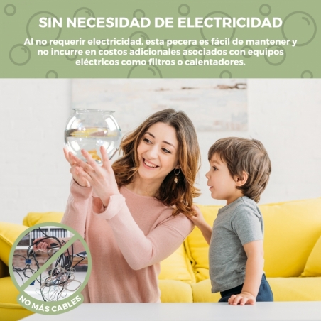 Esta pecera no requiere electricidad, lo que la hace fácil de mantener sin costos adicionales. Su ligereza facilita el transporte, siendo perfecta para aquellos que necesitan moverla de un lugar a otro. Además, después de la decoración, se convierte en una pieza estéticamente agradable, agregando un toque decorativo al entorno.