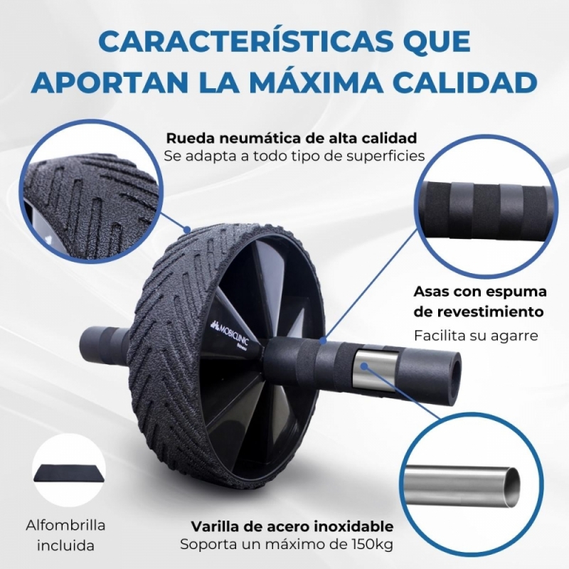 ESTABILIDAD: la estructura de este rodillo de abdominales es fuerte y robusta. Su varilla de acero inoxidable y sus neumáticos de primera calidad permiten que este rodillo abdominal de fitness soporte un peso máximo de hasta 150 kg sin tambalearse. Igualmente, sus varillas garantizan un agarre que harán que tus ejercicios sean más estables.