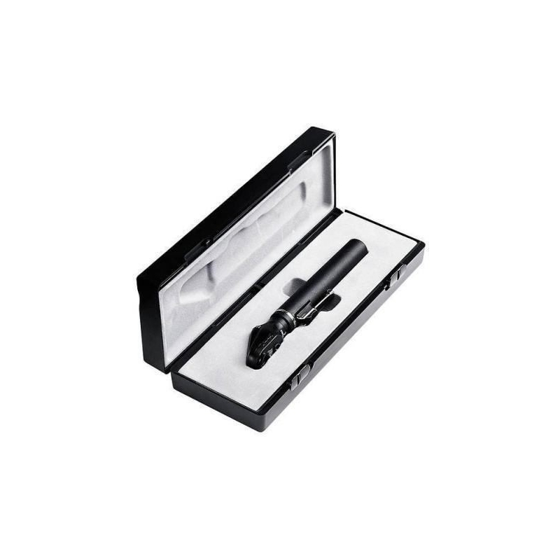 Oftalmoscopio con iluminación halógena de 2,5 v. Consta de rueda de ajuste e indicador de dioptrías, rueda de diafragma de fácil manejo, lentes de protección y carcasa de protección contra el polvo. Se entrega dispuesto en un estuche resistente.