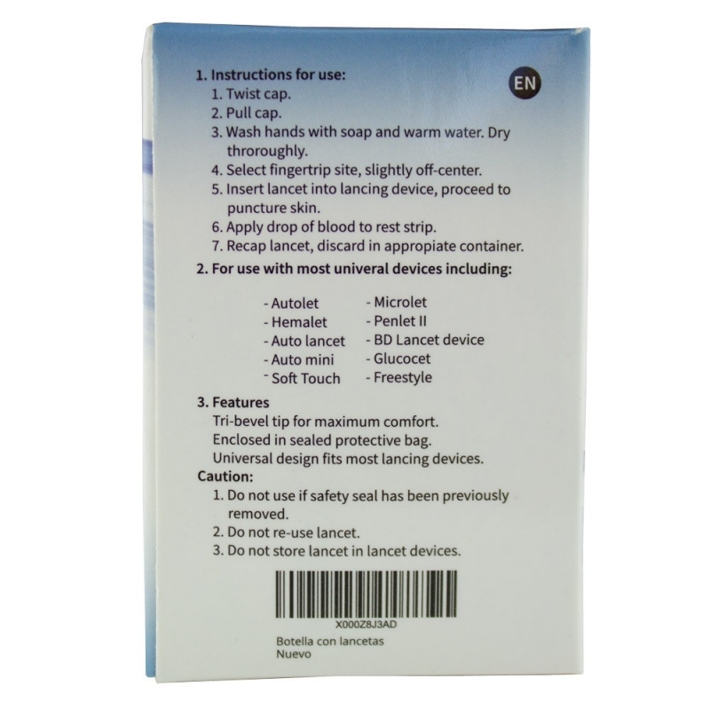 - Las lancetas son compatibles con los dispositivos: Autolet, Hemalet, Auto lancet, Auto mini, Soft Touch, Microlet, Penlet II, BD Lancett device, Glucocet, Freestyle.