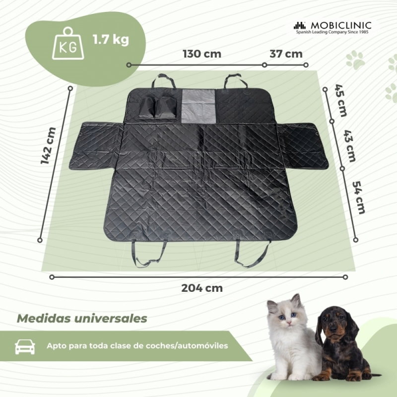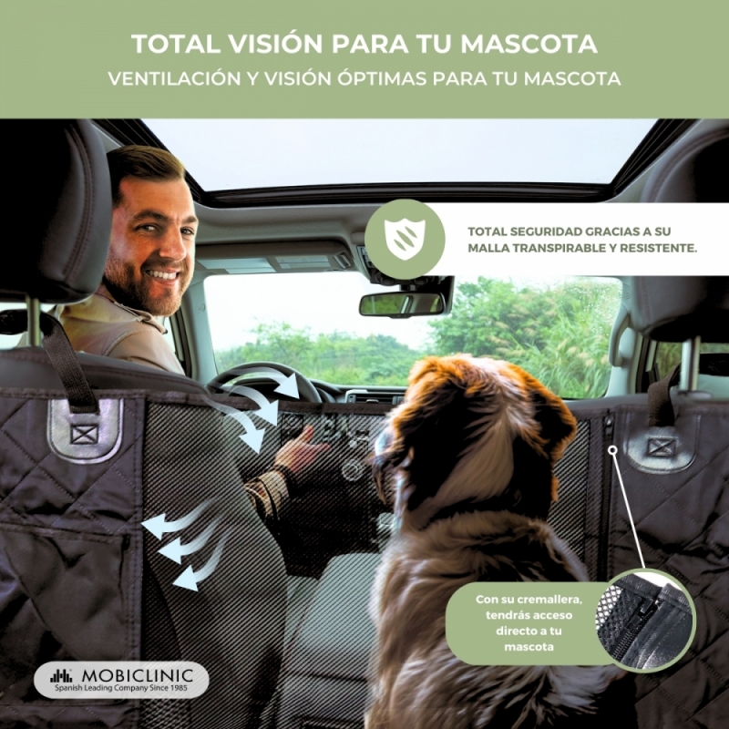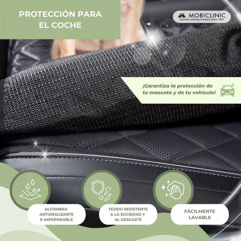 El cubre asiento constituye una doble protección tanto para el perro como para el propio vehículo, ya que evita que se dañe o ensucie el tapizado de los asientos traseros. Además, su alfombra es antideslizante e impermeable, lo que evita daños mayores en días de lluvia o en caso de que el animal haya entrado en contacto con barro u otros agentes.