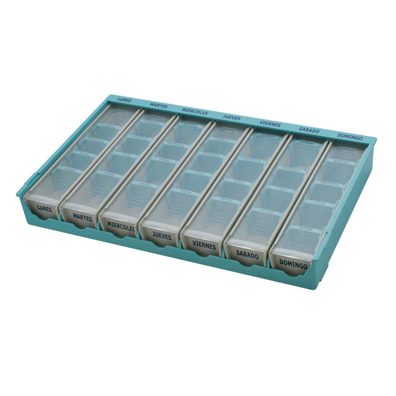 El pastillero está compuesto de 7 pastilleros diarios extraíbles, correspondientes a cada día de la semana, marcados según el día de la semana correspondiente y estos a su vez tienes separadores regulables y extraíbles.