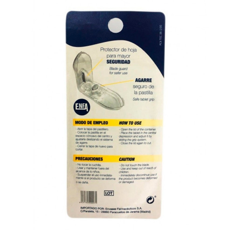 El pastillero está compuesto por una zona de plástico transparente, provista de cuchilla metálica, que permite el fraccionamiento del comprimido, y una zona de almacenamiento de plástico transparente, que permite la identificar claramente si contiene o no medicación.La zona de almacenamiento tiene una capacidad suficiente para almacenar al menos 5-6 comprimidos de tamaño medio.