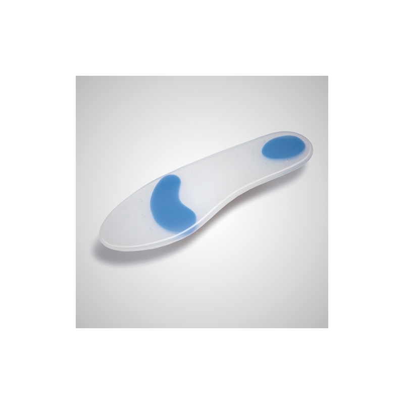 Plantilla de silicona viscoelástica con almohadillas de silicona blanda en las cabezas metatarsales y descarga central en el talón, que permiten una distribución homogénea de las presiones en la planta del pie. Realizan una función de amortiguación del impacto del pie contra el suelo, aportando una sensacion de confort y relajación. Indicadas para el tratamiento de algias plantares, personas que permanecen mucho tiempo de pie, en marchas prolongadas o que realicen ejercicios repetitivos.