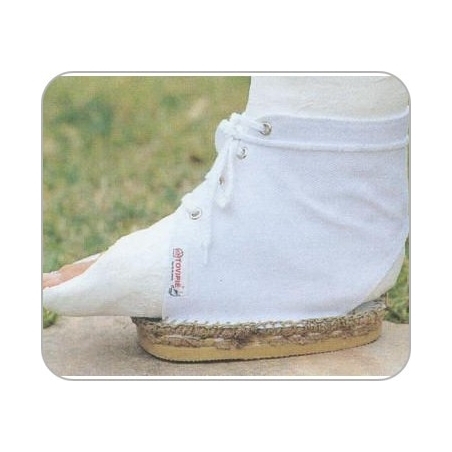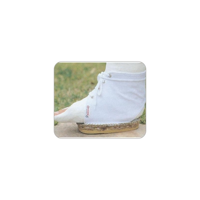 Calzado tipo bota, abierto en la puntera, con suela antideslizante de caucho y parte superior de loneta. Color blanco, ajuste con cordones. Indicado para uso en pie escayolado. Facilita la marcha, evitando que el yeso y vendaje estén en contacto con el suelo.