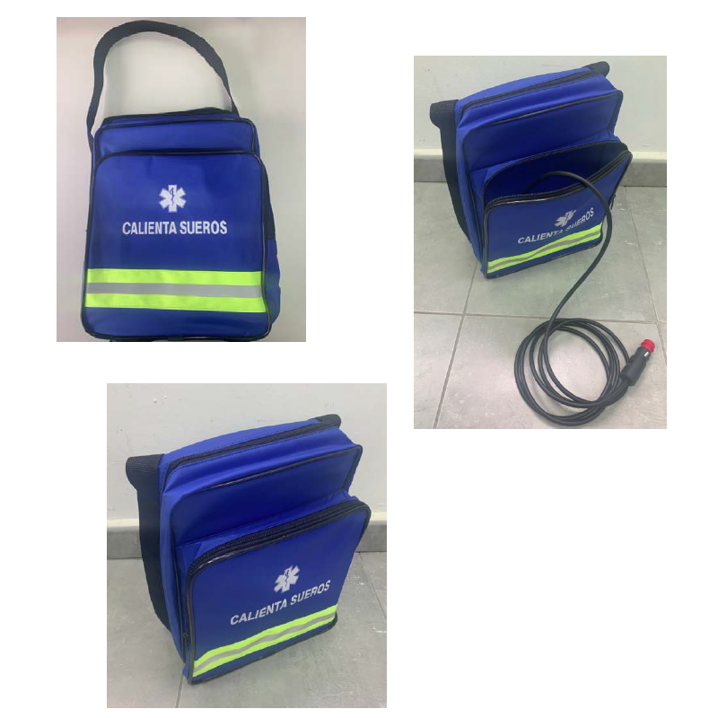Bolsa calienta sueros a 12V con toma a mechero para ambulancia. Permite calentar hasta 2 sueros a la vez a una temperatura constante de 37º. Dispone de soporte para colgar de la barra porta sueros o anclaje de suero de la ambulancia. También dispone de bandolera para facilitar en transporte fuera del vehículo.
