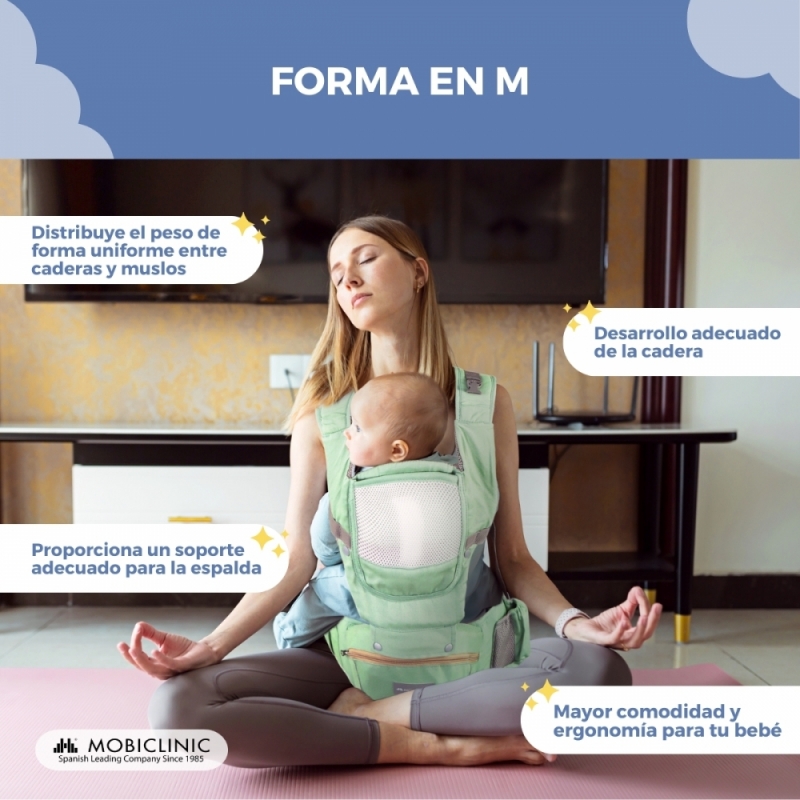 POSICIÓN ERGONÓMICA EN M: La mochila portabebé favorece la postura ergonómica del bebé al permitir que adopte la posición natural de cuclillas. Cuando el bebé va sentado, la mochila proporciona una posición propicia en forma de M, que es óptima para el desarrollo y comodidad del más pequeño, asegurando un soporte adecuado para su espalda y cadera.