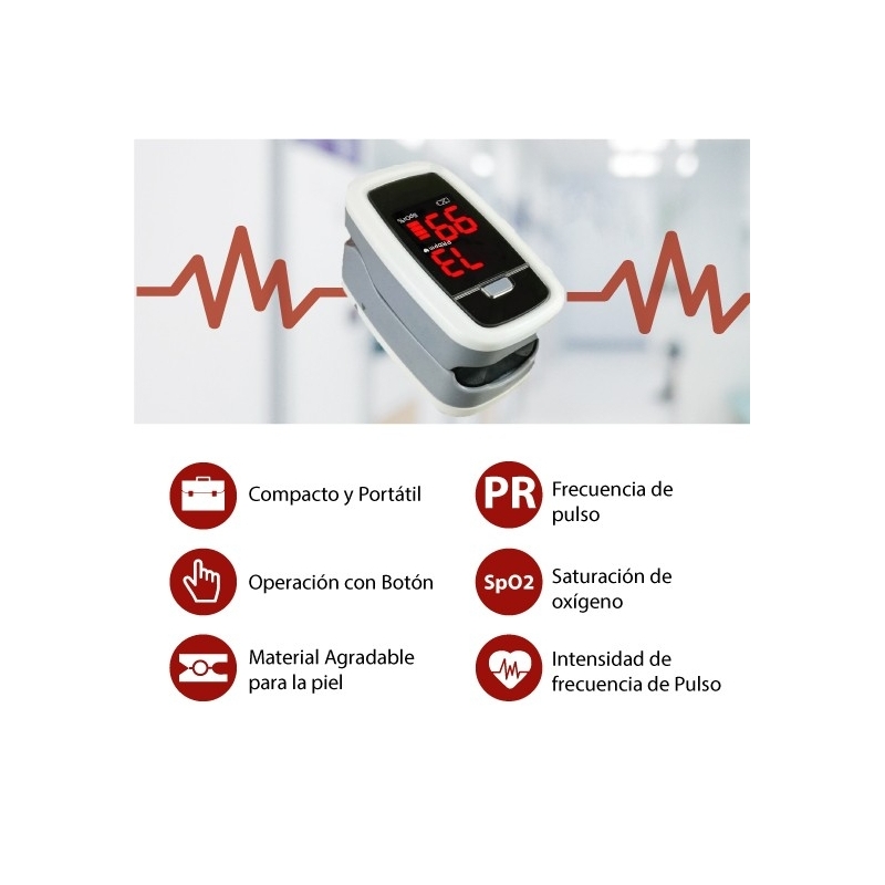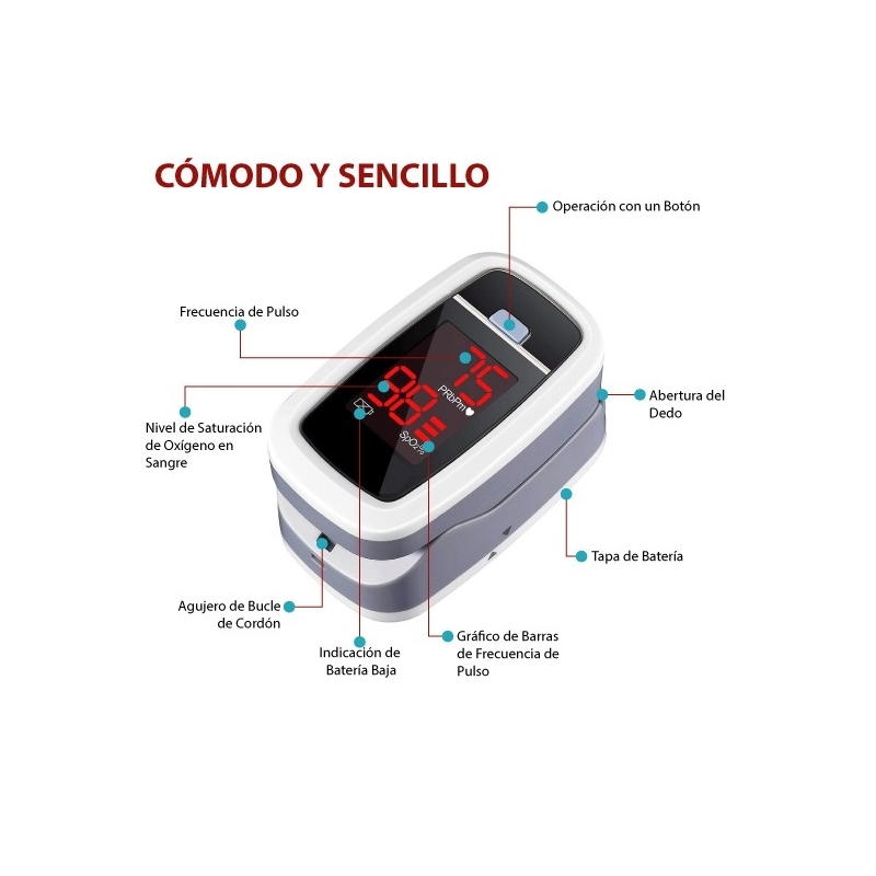 CÓMODO: su tamaño es reducido y es muy fácil de manejar, por lo que este pulsioxímetro de dedo puede usarse en casa, hospitales, centros de salud, etc...