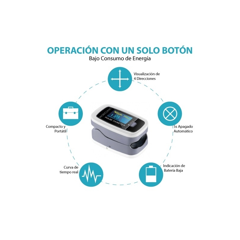 Es un oxímetro de dedo, ligero y fácil de usar. Basta con insertar el dedo y mantenerlos estables. Se presiona el botón para encenderlo y se espera a que el valor se estabilice para leer los datos. Finalmente, habría que mover el dedo hacia el medidor de oxígeno de sangrado y apagar automáticamente.