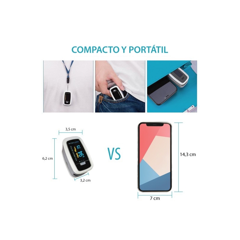 TAMAÑO: este pulsioxímetro de dedo es reducido y de fácil manejo, por lo que puede usarse en casa, hospitales, centros de salud, etc.