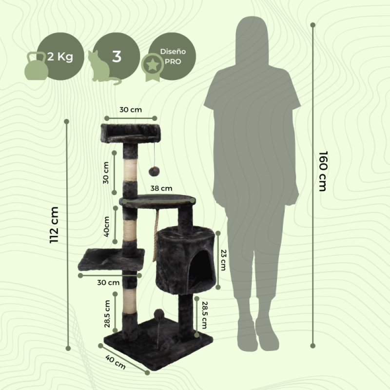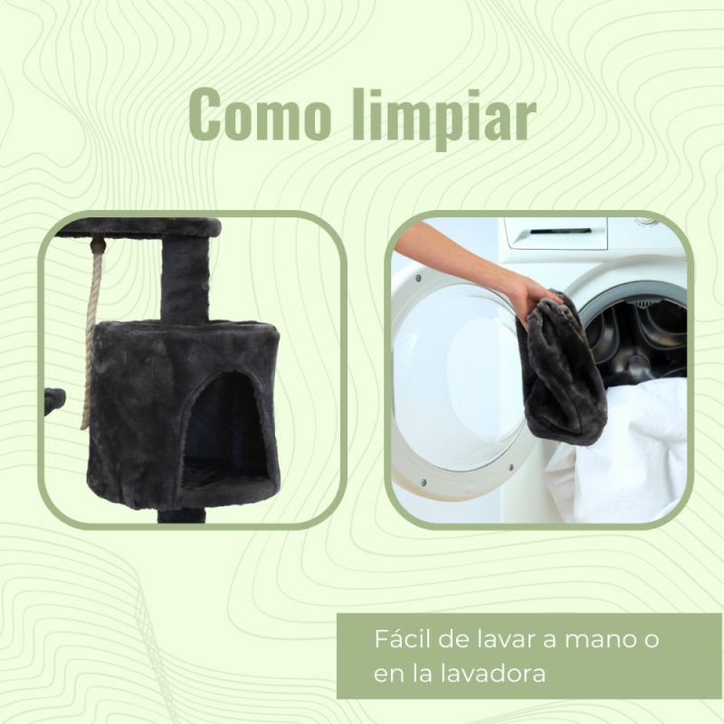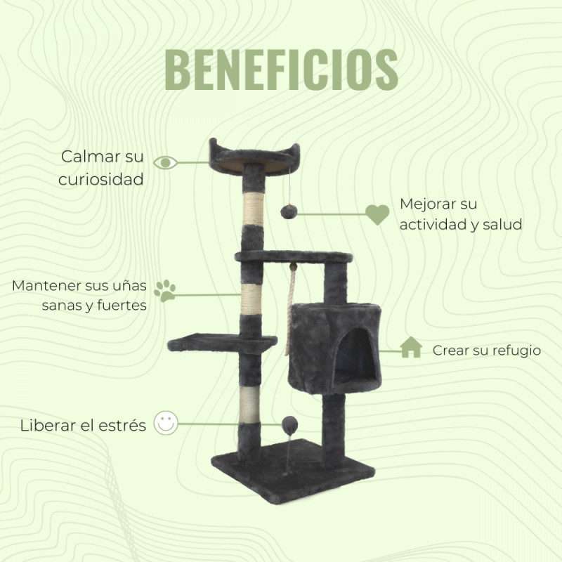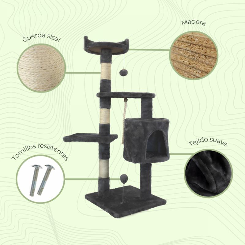 - Dos columnas elevadas: Las columnas perfeccionan el diseño y añaden a la estructura cuerda de sisal para que tu gato juegue y se desestrese con ellas.