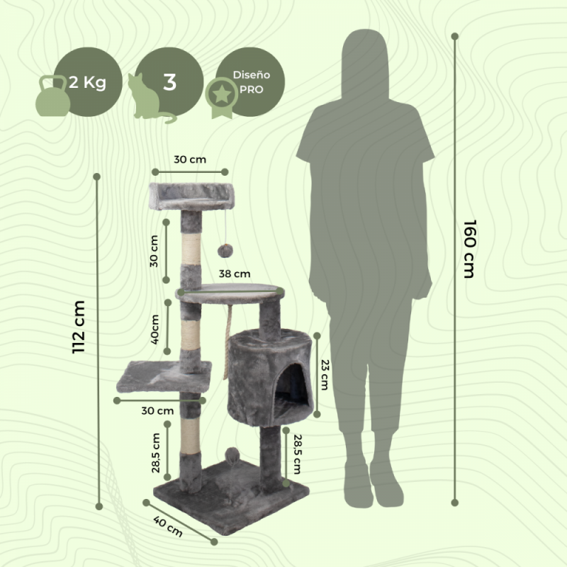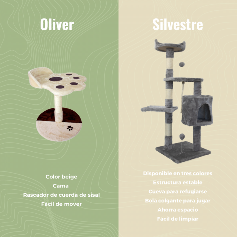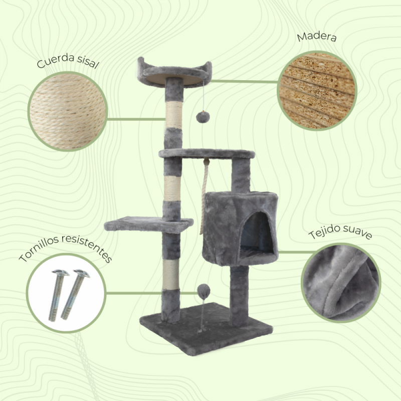 - Dos columnas elevadas: Las columnas perfeccionan el diseño y añaden a la estructura cuerda de sisal para que tu gato juegue y se desestrese con ellas.