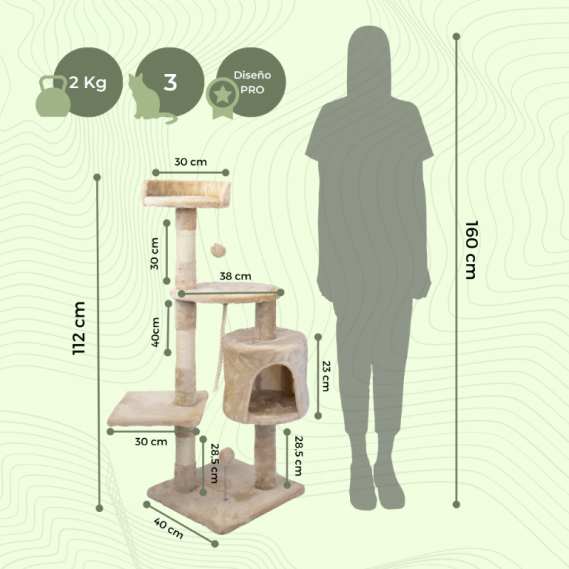Árbol rascador para gatos | Mediano | Rascagatos | 3 alturas | 40x40x112 cm | Beige | Silvestre | Mobiclinic