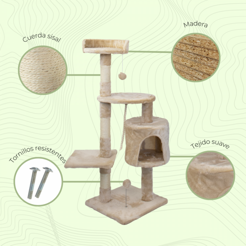 - Dos columnas elevadas: Las columnas perfeccionan el diseño y añaden a la estructura cuerda de sisal para que tu gato juegue y se desestrese con ellas.