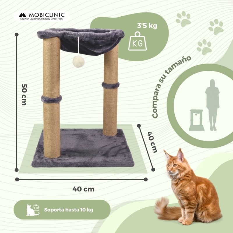 Este árbol rascador para felinos es muy ligero y apenas ocupa espacio, pues tiene unas dimensiones de 40 x 40 x 50 cm. Podrás montarlo en cualquier parte de la casa sin que desentone con el entorno debido a su diseño moderno y sencillo.
