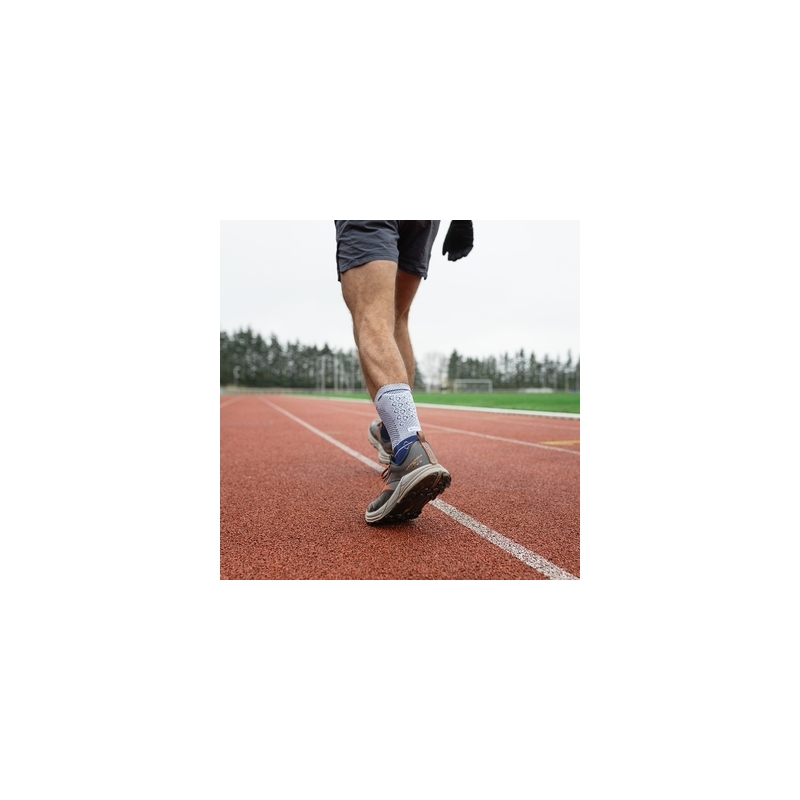 Tejido muy elástico de material transpirable que aporta una eficaz compresión y una excelente comodidad. El tejido de punto de forma anatómica asegura una alta comodidad. La almohadilla del tendón integrada es viscoelástica y está anatómicamente conformada. Una cuña para el talón extraíble está integrada en el vendaje. Para compensar la diferencia de altura en el otro pie, viene incluida una talonera viscoelástica adicional.