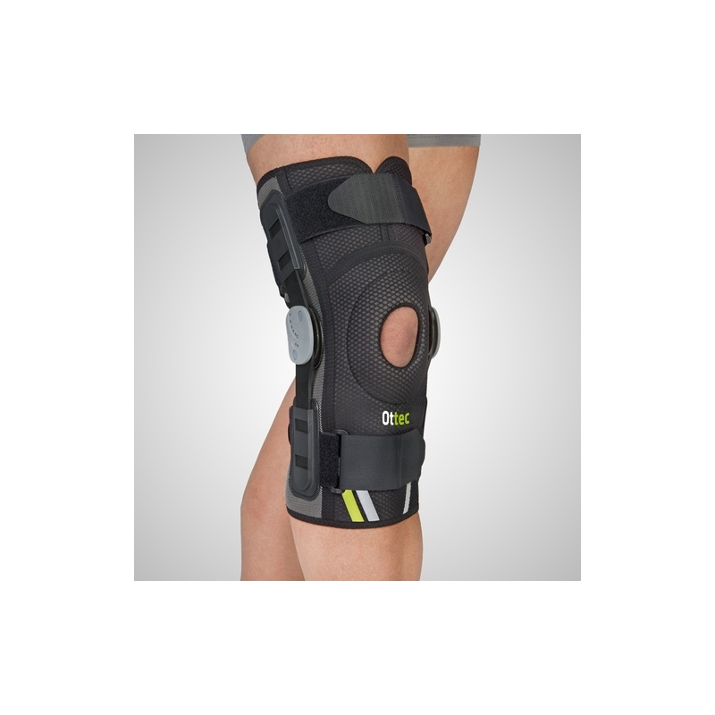 Ajuste mediante bandas de velcro para favorecer la estabilización. Abierta por la parte anterior y superior. Rodete de material viscoelástico. Articulaciones policéntricas graduables a 0º, 30º, 55º, 75º, 95º y 110º de flexión. Alojamiento para la rótula, evitando la presión sobre la misma y facilitando la flexo-extensión.