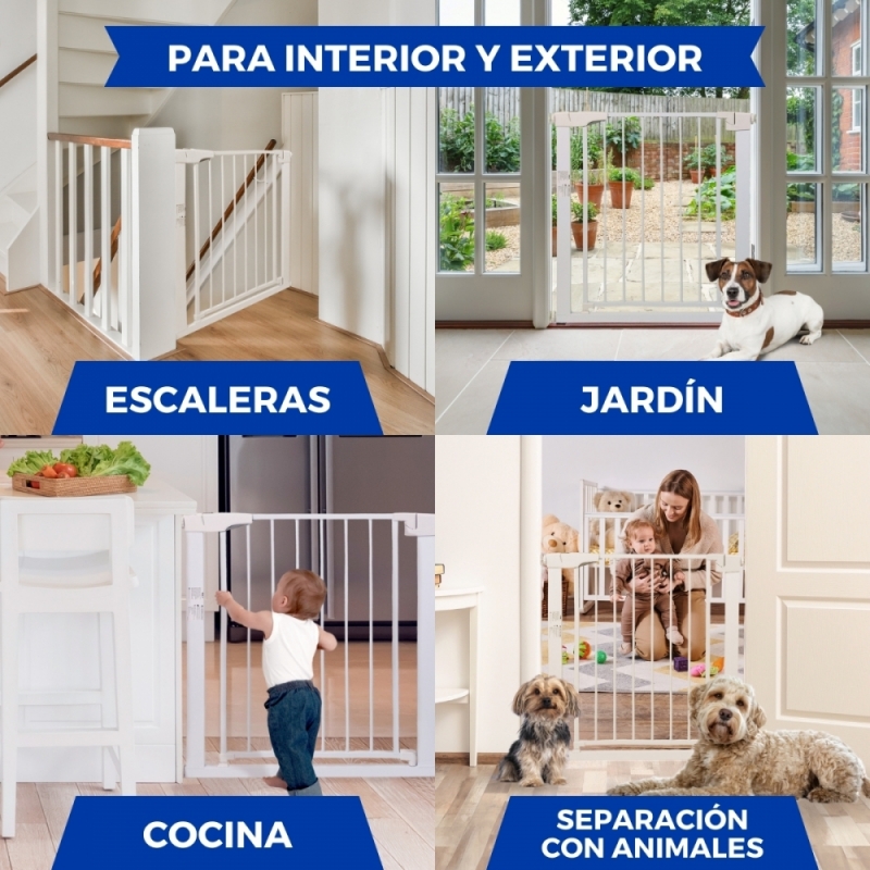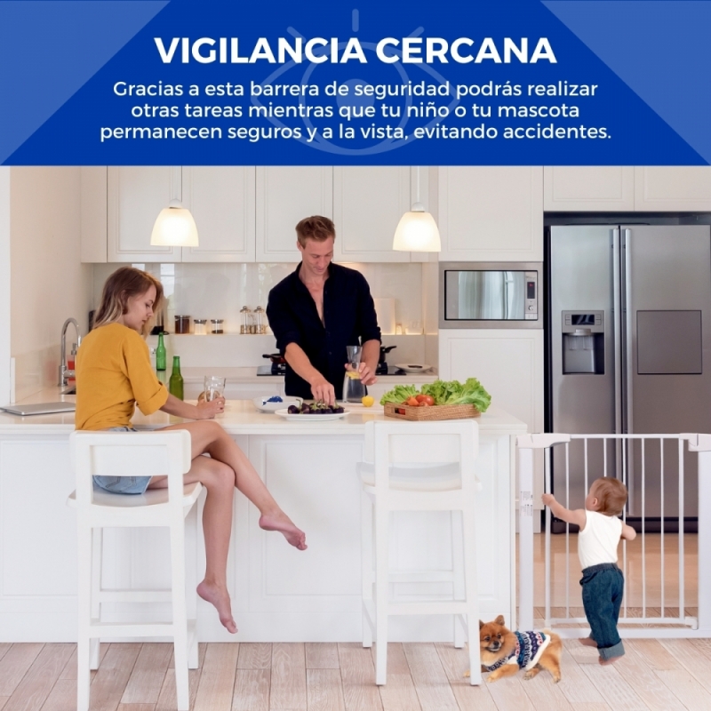 No solo se protege a los pequeños con la barra Raily, también a las mascotas controlando su actividad y evitando que se cuelen por debajo de la barrera puesto que llega hasta el suelo. Ya sea que tu mascota sea joven, anciana o tenga problemas de movilidad, la valla ofrece una solución efectiva para mantenerlas a salvo.