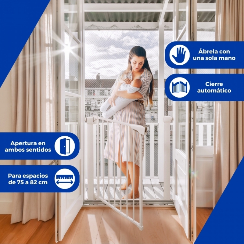 Barrera escalera con puerta |76cm alto |Niños |A presión| Cierre automático |Doble apertura |Regulable 75-82cm|Raily |Mobiclinic