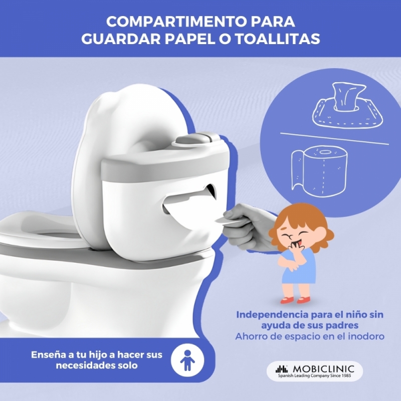 COMPARTIMENTO PARA EL PAPEL: ToiKid dispone de una zona específica para depositar el papel higiénico o las toallitas en la parte donde iría la cisterna. Con el fin de ahorrar espacio, el inodoro incluye también este compartimento de manera que el niño empiece a tener independencia para hacer sus necesidades solo, sin ayuda de sus padres.