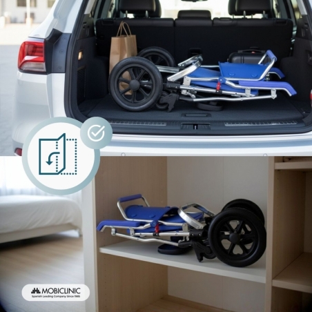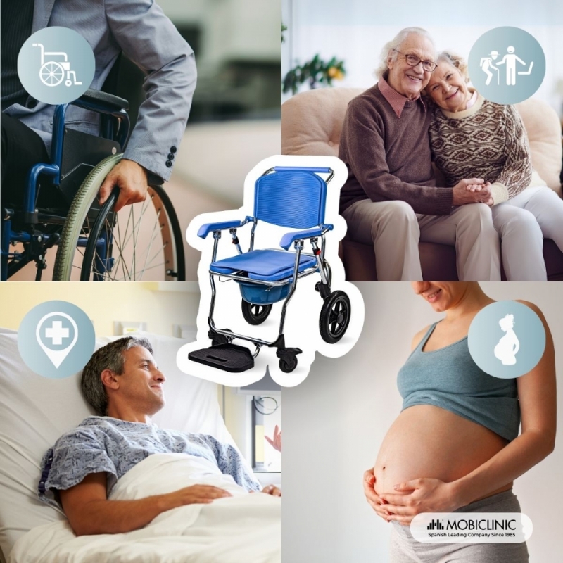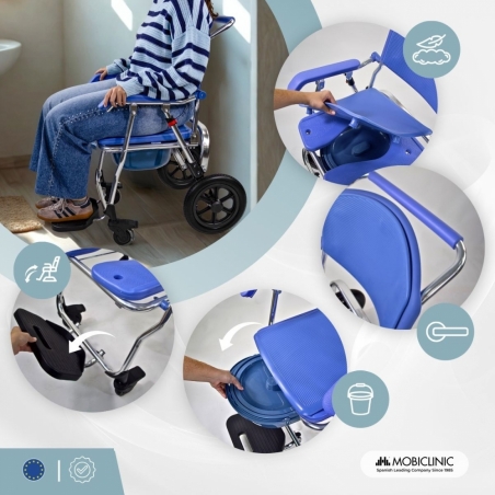 Su diseño es plegable lo que facilita el almacenamiento y transporte de la silla. Puede guardarse sin ocupar espacio y trasladarse de manera sencilla de una estancia a otra, ideal para residencias, hogares y hospitales. Su estructura está pensada principalmente para hacer más fáciles las tareas diarias, reduciendo los movimientos bruscos y las posturas forzadas.