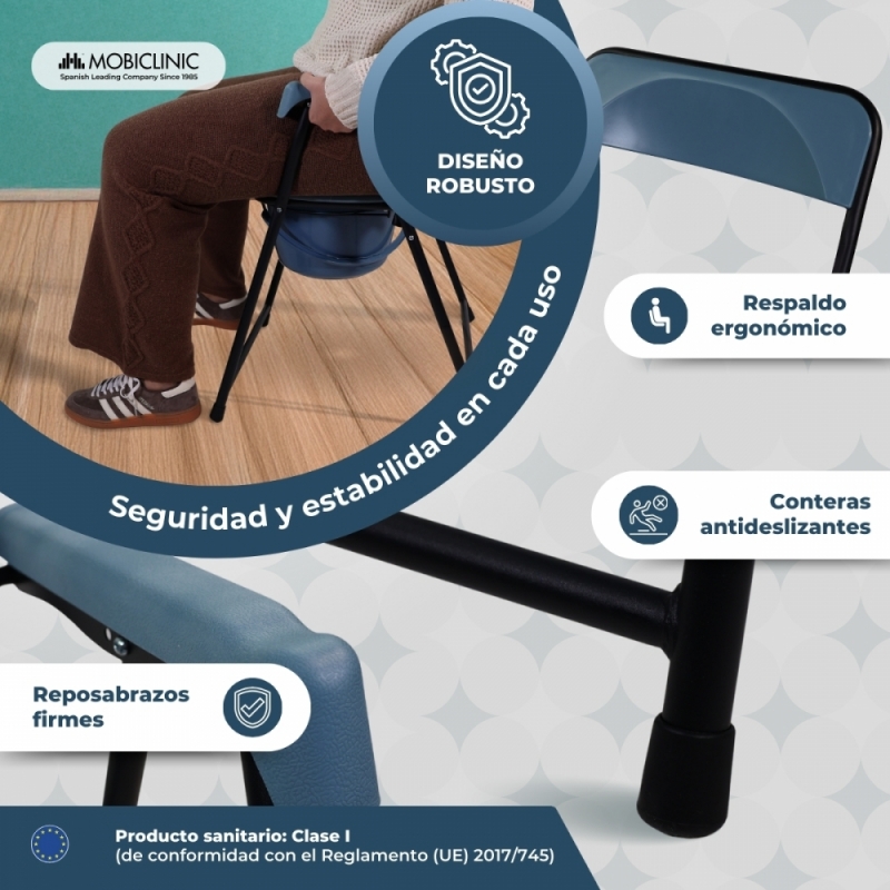 - Esta silla inodoro para discapacitados cuenta con unas conteras antideslizantes que ofrecen una mayor seguridad, y con un respaldo amoldado a la forma del cuerpo en color azul para una mayor comodidad.