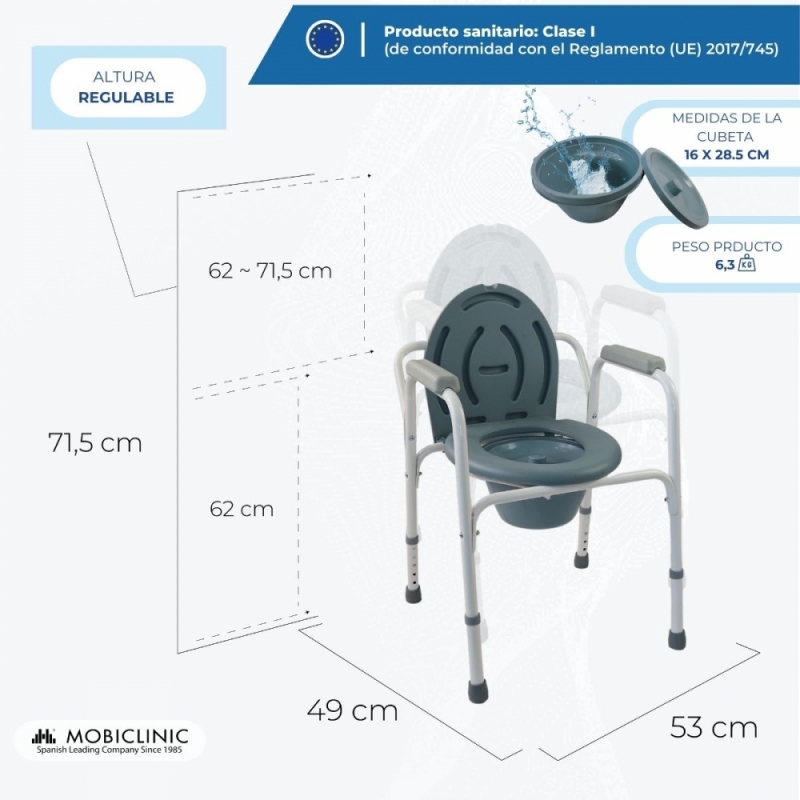 La silla con inodoro incorpora unos cómodos reposabrazos forrados y dispone de altura ajustable lo que la convierte en un inodoro portátil ideal para cualquier estatura.