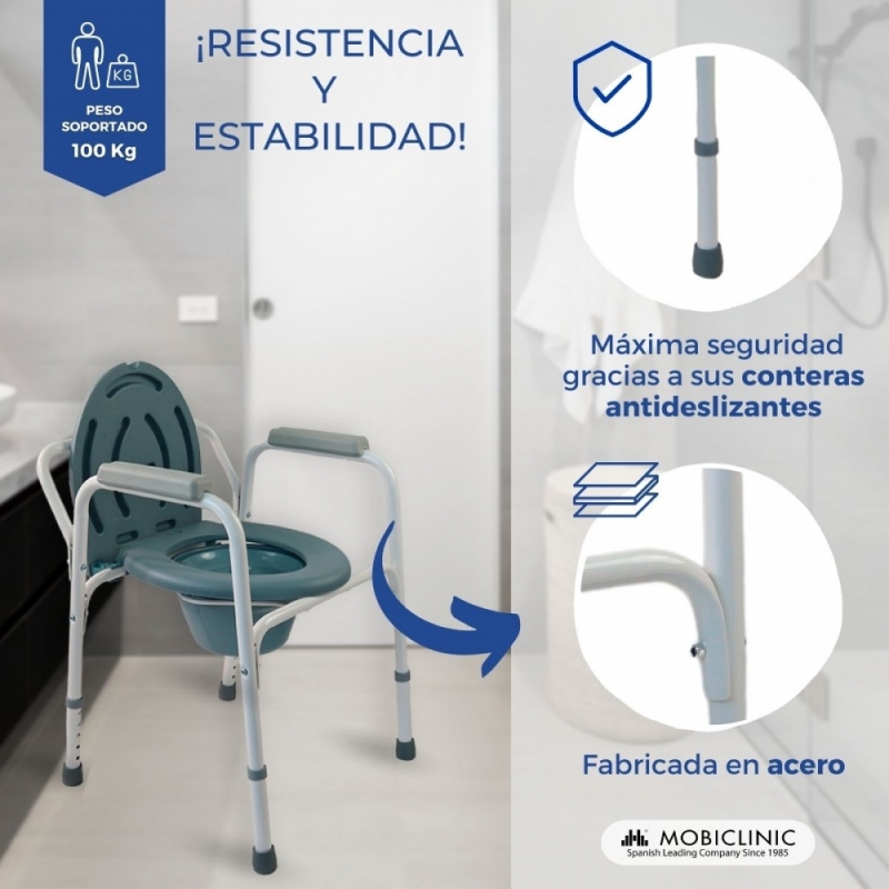 SEGURA: las patas antideslizantes de esta silla con WC aseguran firmeza al suelo y mayor confianza al usuario