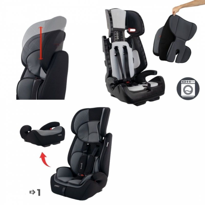 - Silla de coche bebé Isofix: silla homologada y plegable con reposacabezas regulable, respaldo extraíble y arnés con 5 puntos de anclaje que sujetan al niño.