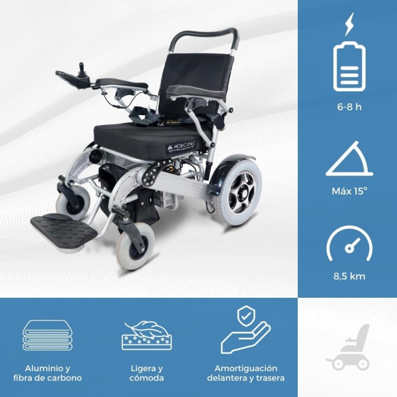 Silla de ruedas eléctrica | Plegable | Aluminio | Auton. 34 km | 24V | Ligera | Troya Plus | Mobiclinic