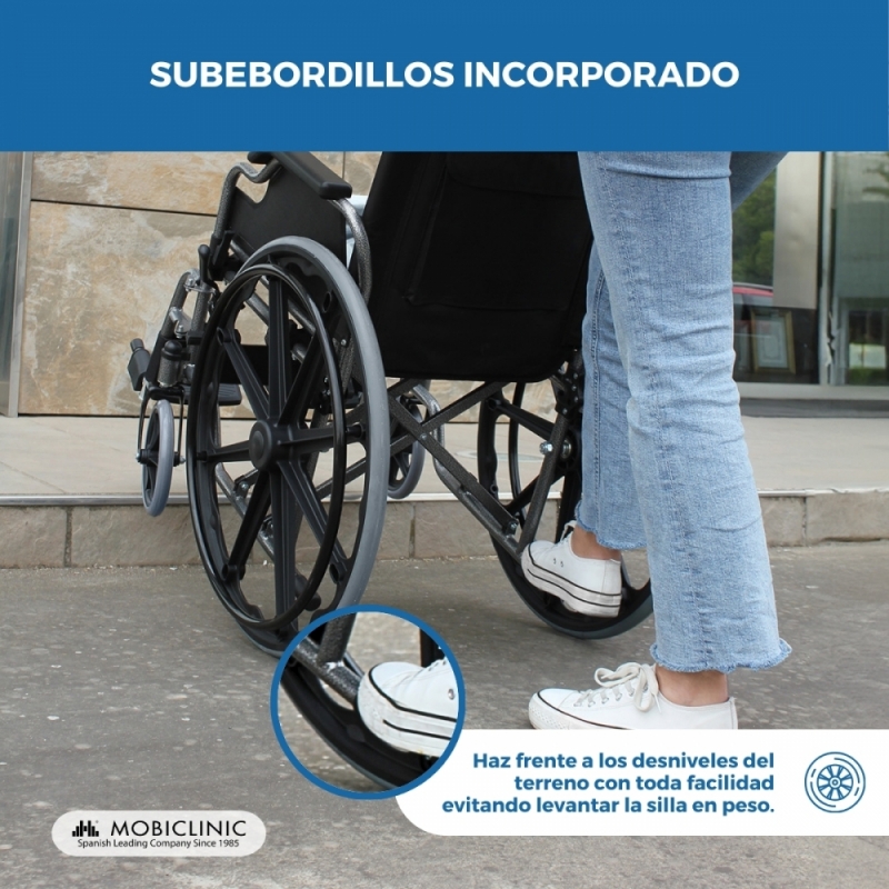 Además, los reposapiés abatibles y desmontables, permiten que la posición de pies y piernas sea la óptima, evitando úlceras por presión, haciéndola una silla de ruedas para ancianos de gran calidad.