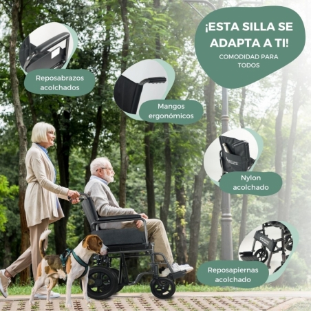 DISEÑO ELEGANTE: la silla de ruedas plegable tiene un elegante y discreto diseño con estructura color antracita y tapicería de nylon. Tiene, además, un bolsillo en el respaldo para llevar cosas personales