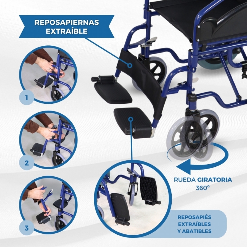 CÓMODA: Para garantizar la comodidad, la silla de ruedas plegable modelo Maestranza tiene reposapiés desmontables y giratorios, así como reposabrazos abatibles hacia atrás y desmontables.