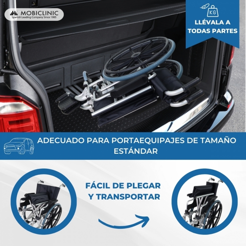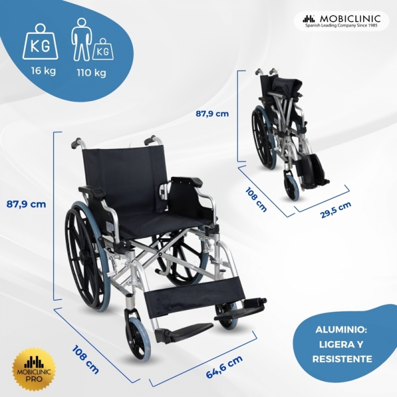 LIGERA Y RESISTENTE: la estructura de aluminio de esta silla de ruedas plegable muestra una gran ligereza y resistencia, pesando solamente 16 kg.