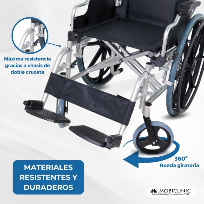 Esta silla de ruedas para ancianos está fabricada en aluminio ligero de alta resistencia, lo que aporta una gran resistencia y ligereza.