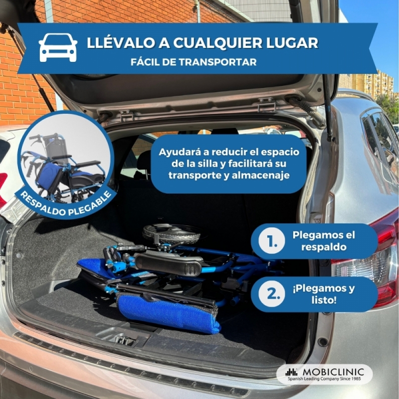 PLEGABLE: La silla de ruedas Pirámide se puede almacenar de forma sencilla gracias a su plegabilidad. Además, ofrece un respaldo partido y unos reposapiés abatibles que hacen que su tamaño se reduzca considerablemente