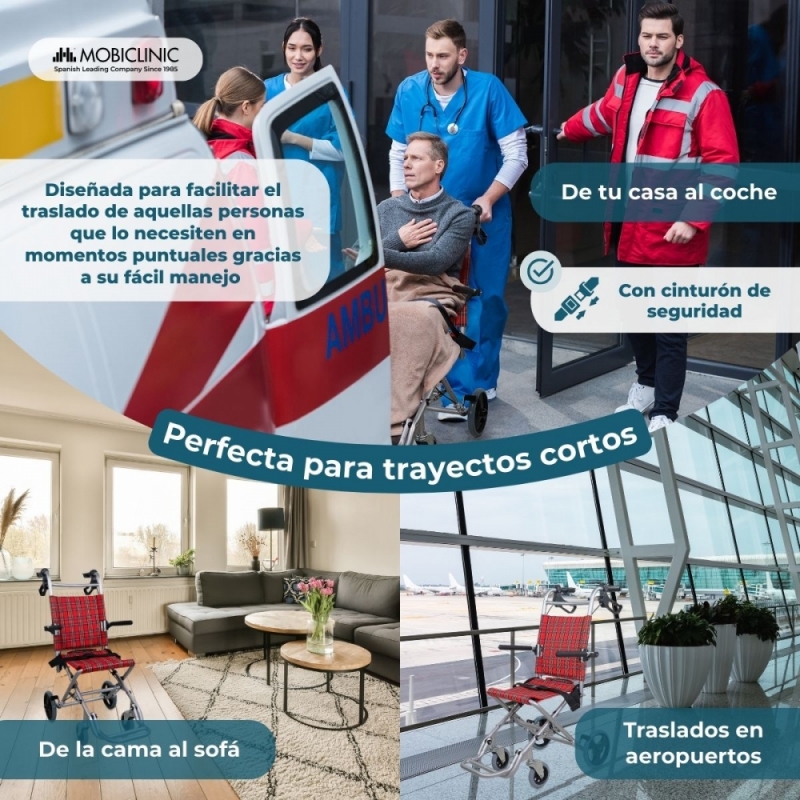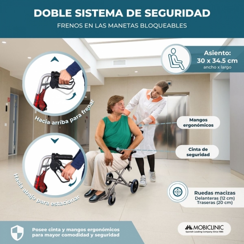 SEGURA: la silla de ruedas de traslado dispone de una doble barra de seguridad fabricada con material ignífugo para aportar mayor resistencia.