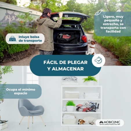 Gracias a su fácil plegado y ligereza es posible transportarla a cualquier lado con el mínimo esfuerzo (además incluye bolsa para transporte). La silla de ruedas plegable permite poder guardarla de forma cómoda en casa o incluso plegarla si la necesitas meter en lugares estrechos.