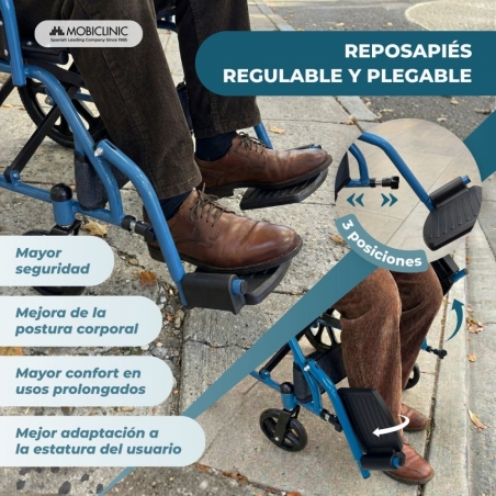 Los reposapiés son plegables y regulables, facilitando el acceso del usuario y el almacenamiento de la silla. Su diseño amplio favorece una posición cómoda de las piernas y las correas para los pies aportan un extra de sujeción y estabilidad durante el desplazamiento.