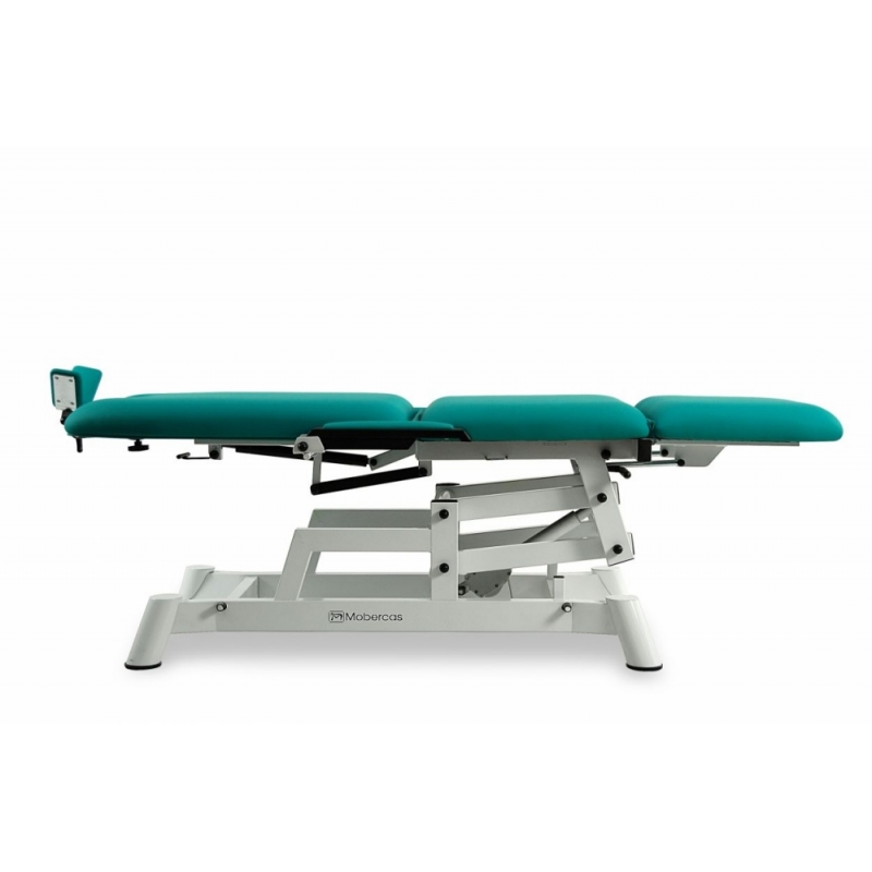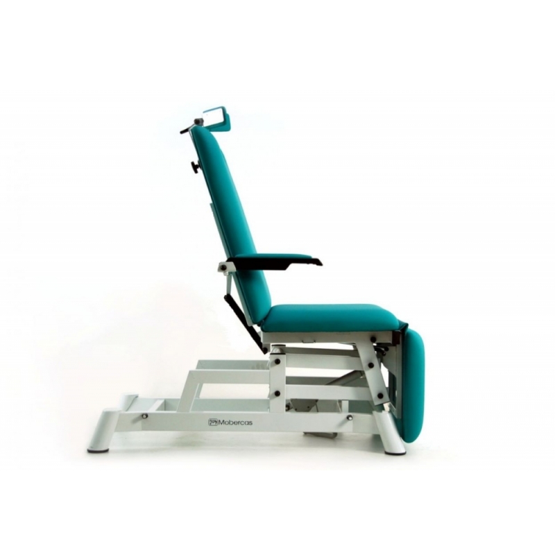 Sillón de oftalmología eléctrico con regulación de altura mediante mando de mano. Incluye apoyabrazos abatible 90º (metálicos y tapizados) y cabezal ergonómico para oftalmología. Posición de Trendelenburg compensado.