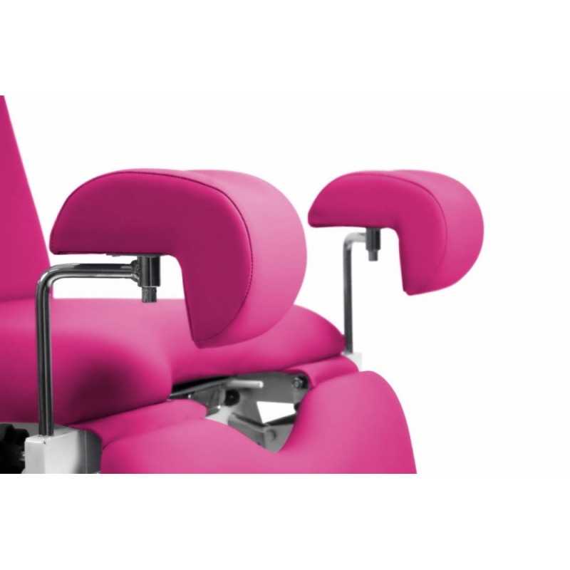 Sillón de reconocimiento ginecológico hidráulico con regulación de altura motorizada. Incluye perneras ginecológicas, bandeja extraíble de acero inoxidable y cojín cervical ergonómico. Posición de Trendelenburg compensado.