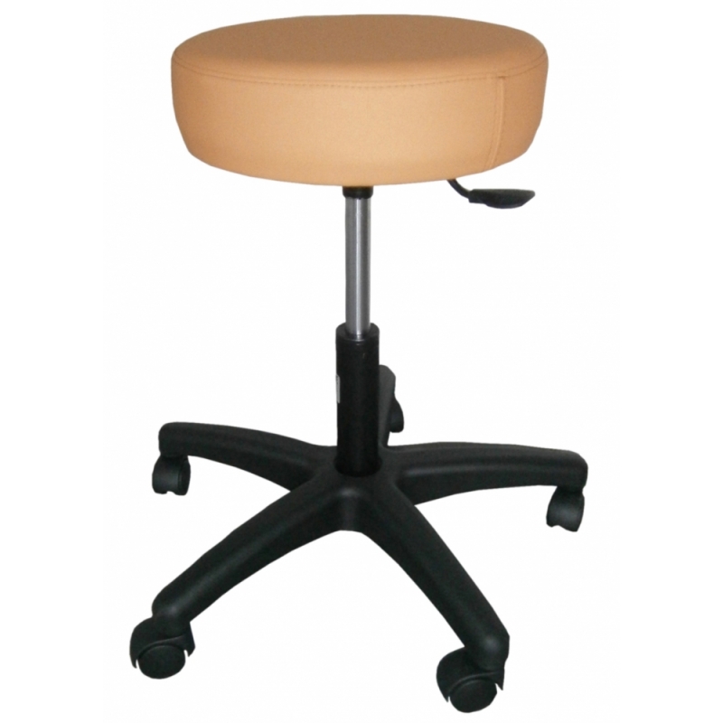 Taburetes giratorios y rodables. Regulables en altura por cilindro hidroneumático de gas por palanca lateral. Pistón de acero pintado en negro. Base negra reforzada de Poliamida (Nylon) y fibra de vidrio de 54 cm. Sistema de 5 ruedas de doble banda de 50 mm. Asiento de 34 cm de diámetro, y 9 cm. de grosor, con goma espuma de 25 kg /cm2 y tapizado técnico vinílico (PVC / Poliester, 650 gr/m2.) con resistencia a la abrasión, transpiración, saliva, sangre, orina, luz UV, aceites y manchas. Resistencia a altas y bajas temperaturas. Protección antimicrobiana, antibacteriana y antimicótico. Ignífugo M2 y lavable. Impermeabilidad. Medidas: Ancho 54 x Largo 54 x Alto 56-77 cm. Peso 5 Kg.