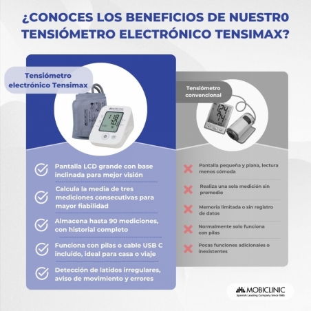 El tensiómetro de brazo Tensimax ofrece una experiencia completa, intuitiva y precisa a la hora de controlar la presión arterial desde casa. Gracias a su manejo desde un único botón central, es fácil de usar y accesible para cualquier usuario. Además, su base inclinada con soporte mejora la visibilidad y permite leer los resultados de manera cómoda.
