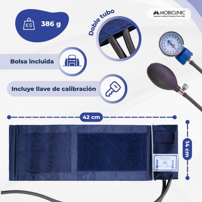 Tensiómetro aneroide | Tensión arterial | Dos salidas | Cómodo | Adaptable | Azul | Mobiclinic